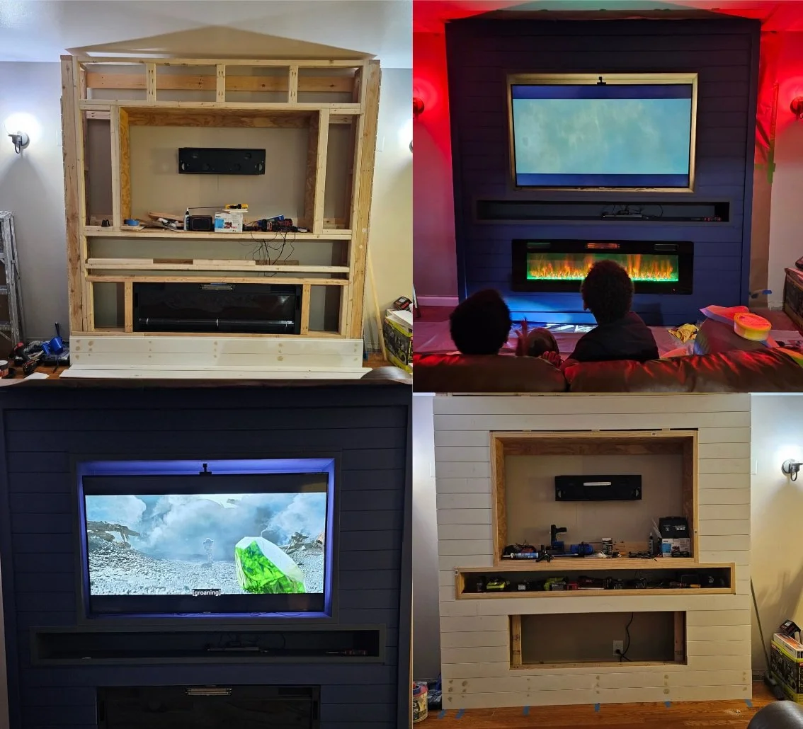 The Patterson Family have a wide open square shaped living room where they spend the majority of their time. They wanted a central focal point for the living room with an eye catching dramatic design that people would see when they first step foot in their home. We created a large piece for the TV and a small fireplace, perfect for cozy movie nights and game day Sundays.