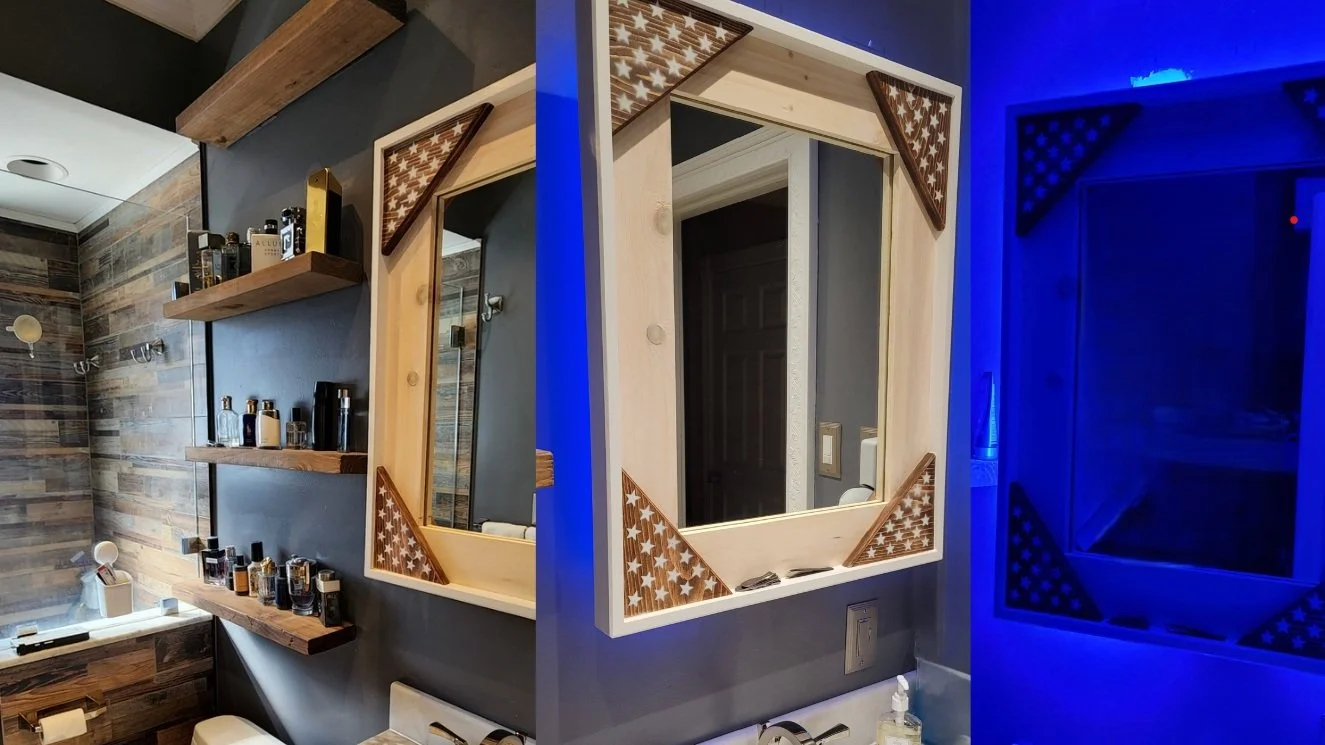 The Lewis Family wanted a more modern yet natural feel in their bathroom renovation. We created a custom Stars and Stripes mirror design, with matching shelves and brought their vision to life while staying under budget.