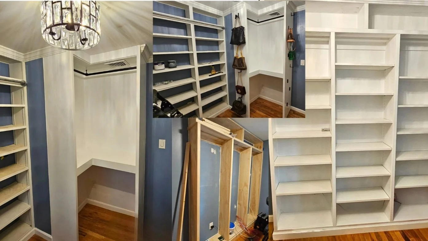 Taryn and Caleb wanted to transform their small bedroom into a large walk in closet. For the creation of the closet we focused on ensuring enough space for a collection of shoes and purses. Due to the irregular and uneven shape of the room, we took into consideration ways to use the corners for shelving, while keeping the space open, airy and bright.